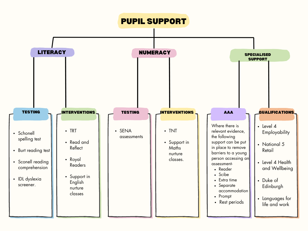 The Pupil Support department has a critical role in ensuring that every candidate is given an equal opportunity to demonstrate their attainment, regardless of any barriers that they may have in their learning. The department works closely with Class Teachers, Faculty Heads, and the SQA Coordinator in providing alternative assessment arrangements, and together they make sure this process is fair and operates with integrity.