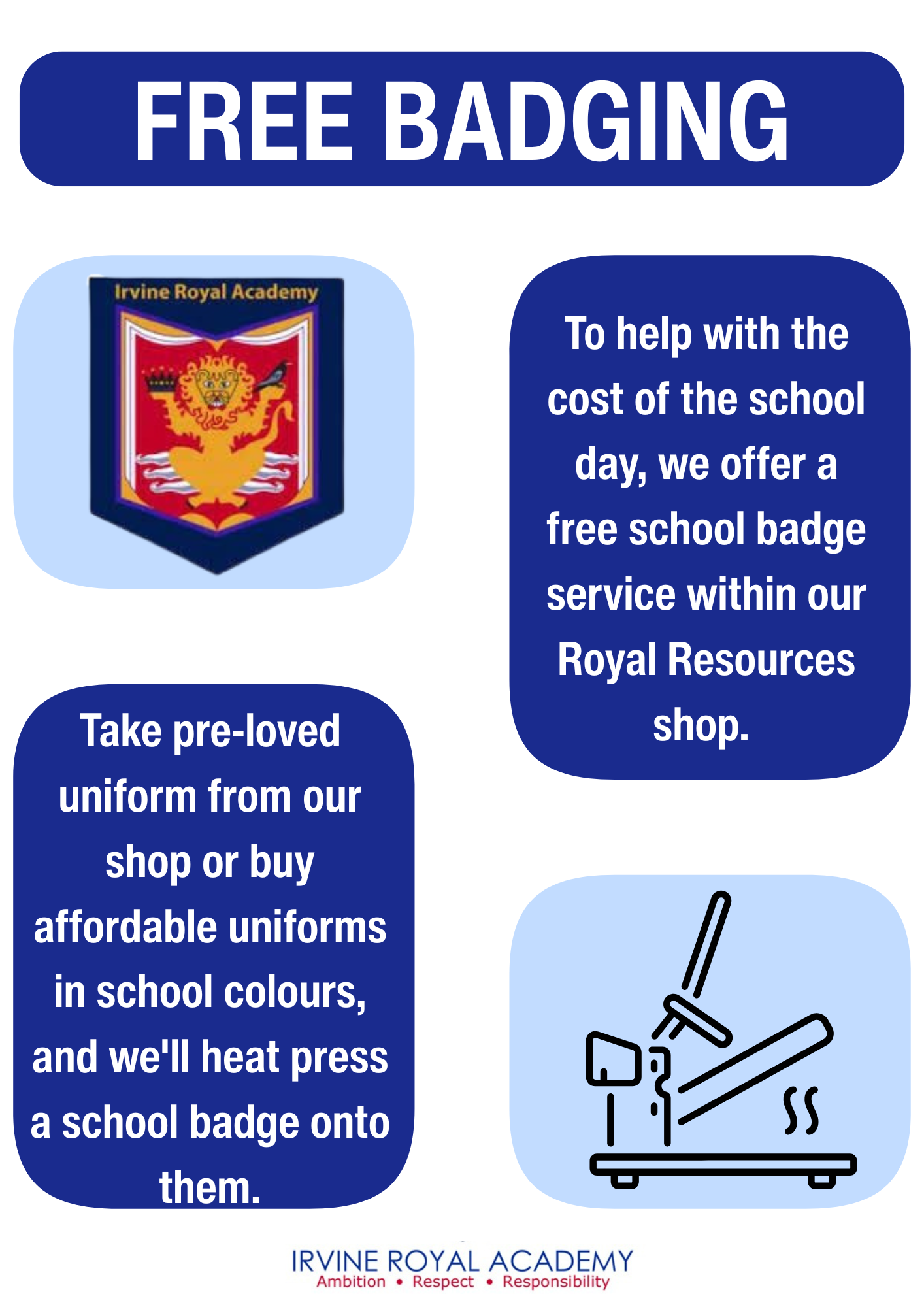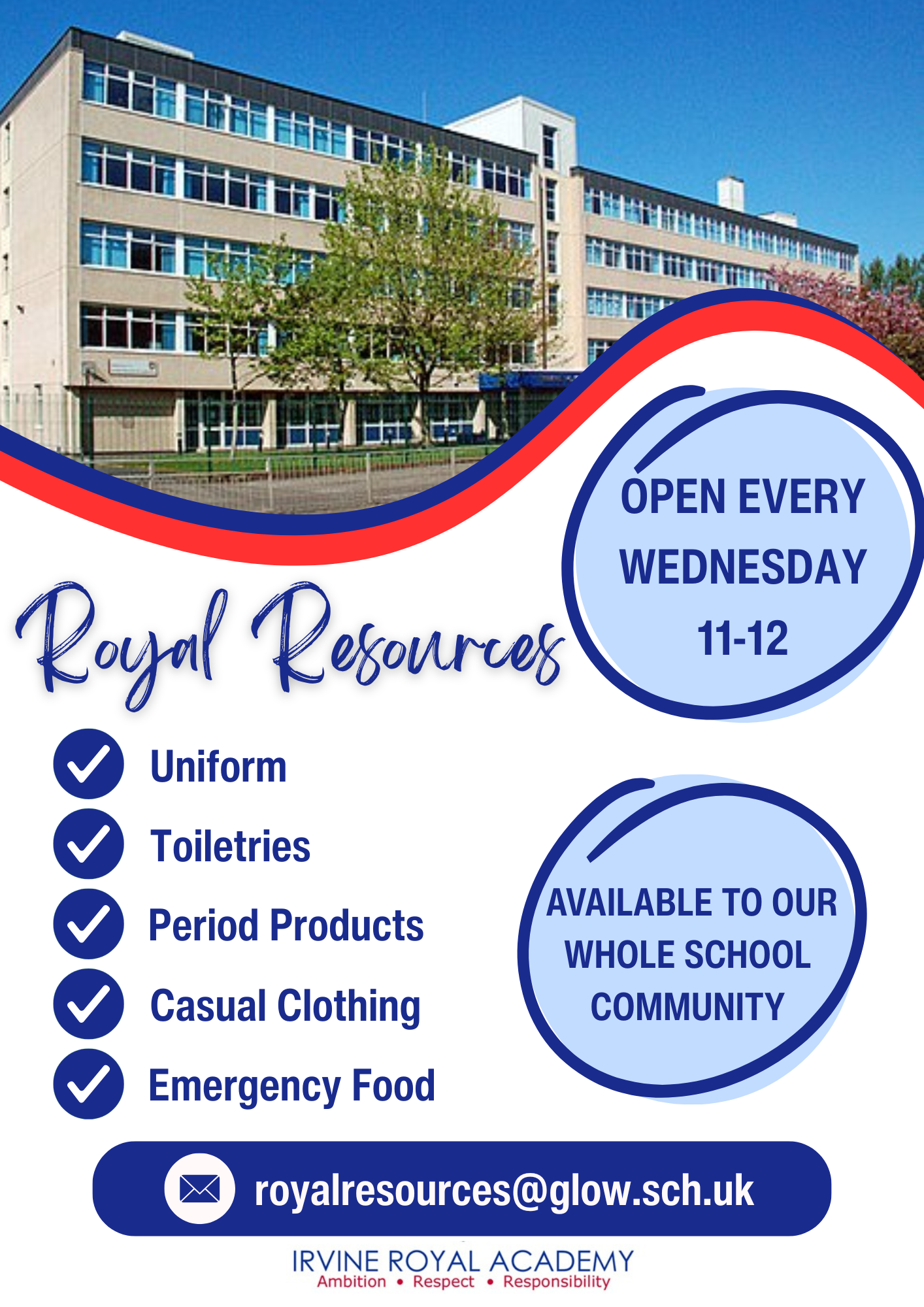 At Irvine Royal Academy, we believe that every student should feel confident and included in school. A key part of this is ensuring that all young people have access to the appropriate school uniform, regardless of their circumstances. That’s why we are proud to offer free school uniform items through our Royal Resources Shop.