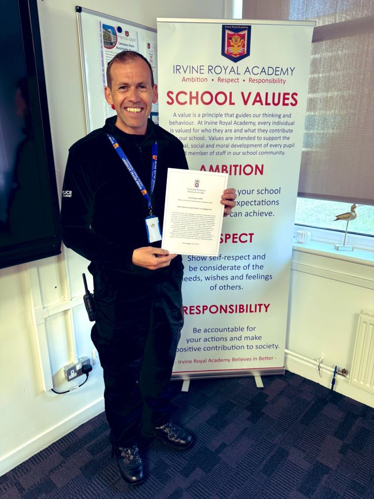 Our campus Police Officer’s role is to positively engage with pupils and staff, respond to situations which may include restorative conversation/informal chat/ or more formal police procedures. Support is also provided in general for staff and pupils whether that be advice or working in partnership with Social Work/CAMHS/Education/NHS etc. Presentations are delivered on certain topics within PSE classes eg. Drugs and Alcohol, Anti-Bullying and online safety.